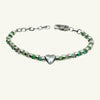 Bracciale realizzato con crisoprasio sfaccettato da 3 mm, alternato a sfere Heishi placcate argento che conferiscono un tocco raffinato e moderno. Al centro spicca un cuore di ematite da 8x8 mm, simbolo di eleganza e romanticismo. La struttura del bracciale è in acciaio inox resistente, con una lunghezza regolabile da 15 cm a 19 cm, per una vestibilità perfetta. Un accessorio delicato e versatile, ideale per valorizzare ogni stile con classe.