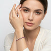 Le pietre sono intervallate da separatori placcati argento a effetto specchiato, che aggiungono luminosità e un tocco di eleganza. Al centro del bracciale risplende un punto luce cristallino, mentre su un lato è presente una sfera di Adularia (Pietra di Luna), simbolo di equilibrio, intuizione e femminilità.