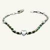 Bracciale smeraldo sfaccettato da 2.5 mm, alternato a separatori in acciaio inox. Al centro, un cuore di ematite da 8x8 mm aggiunge un tocco romantico, mentre due stelle da 5x5 mm sui lati completano il design con un elemento di brillantezza. La struttura del bracciale, realizzata in acciaio inox, garantisce resistenza e comfort. Con una lunghezza regolabile da 17 a 19 cm, il bracciale si adatta facilmente al polso.