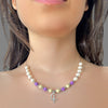 Realizzato con raffinate perle e dettagli in pietra lavica colorata nei toni del viola e del beige, combina naturalezza e stile in un design irresistibile. Con una lunghezza di 41 cm, è perfetto per valorizzare ogni outfit, aggiungendo un tocco di classe e originalità. Ideale per chi ama distinguersi con gioielli dalla personalità forte e dal fascino senza tempo. Scegli questo girocollo per un look che non passerà inosservato!