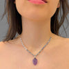 Collana in acciaio inox regolabile da 36 a 40 cm, composta da cristalli sfaccettati color argento, sfere viola e quarzo rosa levigato. Il pendente è un’ametista a goccia da 21x16 mm, perfetta per aggiungere un tocco di raffinatezza.