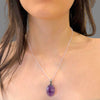 Un’elegante collana rosario con rondelle sfaccettate di vetro rosa e un pendente in ametista ovale da 20x18 mm. Lunghezza totale di 44 cm. Un tocco di spiritualità e stile.