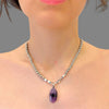 Collana in acciaio inox regolabile da 37 a 41 cm, composta da sfere di ematite, elementi in acciaio inox e cristalli azzurri. Il pendente centrale è un’ametista ovale da 22x15 mm. Un accessorio raffinato, perfetto per completare il tuo stile.