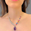 Collana in acciaio inox regolabile da 37 a 41 cm, composta da pietra lavica multicolor e rondelle in acciaio. Il pendente centrale è un’ametista ovale da 25x17 mm. Un accessorio vivace e distintivo.