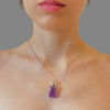 Collana in acciaio inox con sfere glitterate rosa, lunghezza taglia unica di 40 cm. Un'altra versione presenta sfere glitterate color argento e lunghezza taglia unica di 39 cm. Il pendente è un’ametista rettangolo da 24x16 mm.