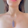 Pendente charoite ovale 46x18 mm, nota per i suoi intensi riflessi viola e le sue sfumature uniche che sembrano dipinte a mano. La collana rosario in acciaio inox, con sfere glitterate celesti, esalta la pietra creando un contrasto raffinato e accattivante. Con una lunghezza di 46 cm, questo gioiello è perfetto per chi desidera un accessorio che unisca classe e carattere.