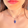 Un pendente di lapislazzuli a forma di goccia da 25x14 mm è abbinato a una collana in acciaio inox in stile rosario, decorata con sfere di cristalli sfaccettati blu. Con una lunghezza di 49 cm, questo gioiello raffinato ed elegante aggiunge profondità e colore a ogni look.