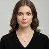 La collana presenta un punto luce di drusa bianca da 10x10 mm, che aggiunge luminosità e raffinatezza al design. La catenina, realizzata in acciaio inox resistente, garantisce una lunga durata e un look moderno. La lunghezza è regolabile da 38 a 41 cm, per adattarsi perfettamente a diverse scollature.